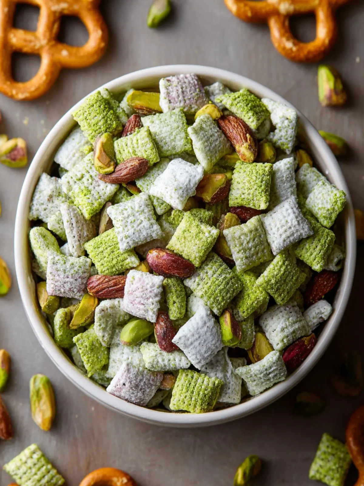 • Snacking Bowls: Create a festive snack station at your next gathering with bowls of easy pistachio puppy chow alongside complementary snacks like pretzels or popcorn. It’s sure to be a hit!