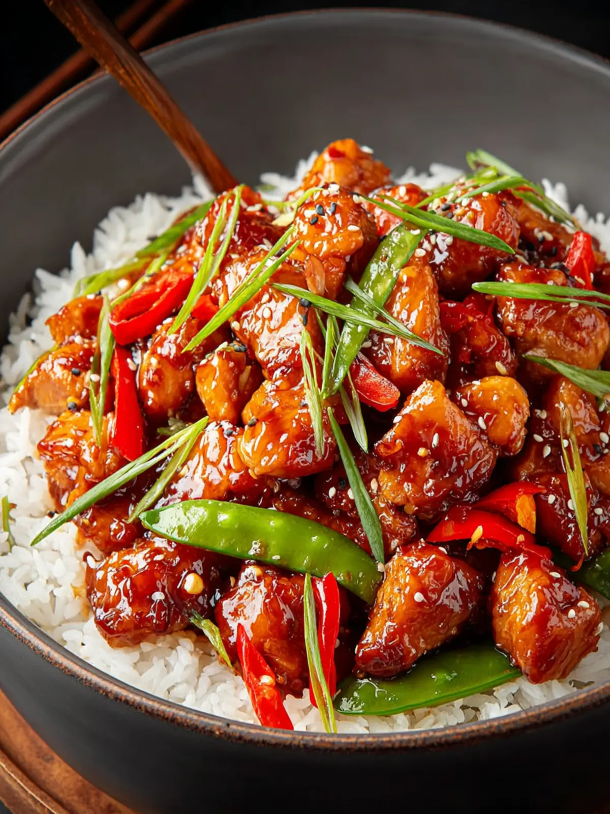 A delicious stir-fry featuring marinated chicken, colorful vegetables, and a sweet chili sauce.